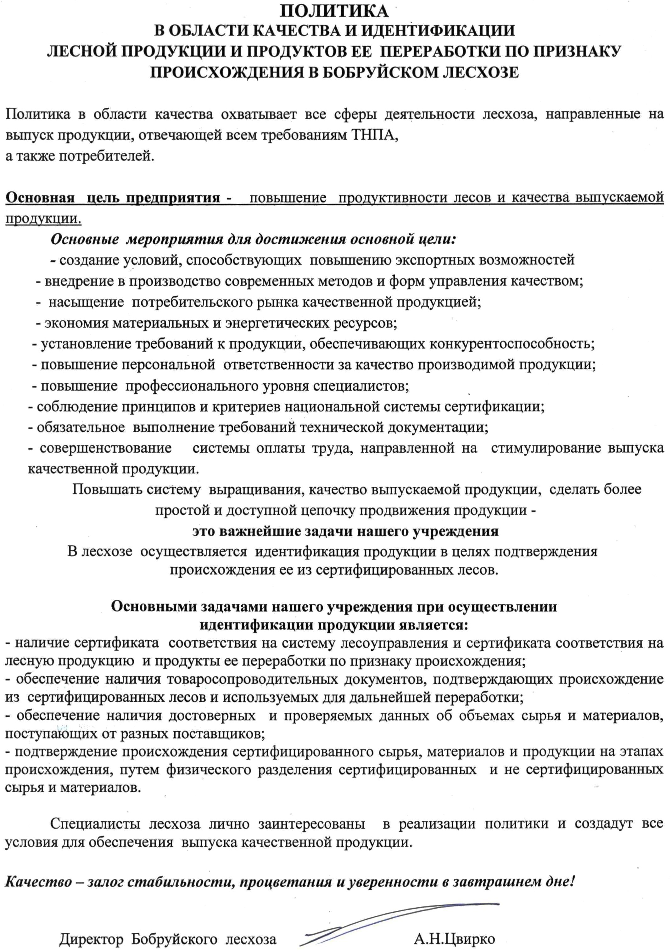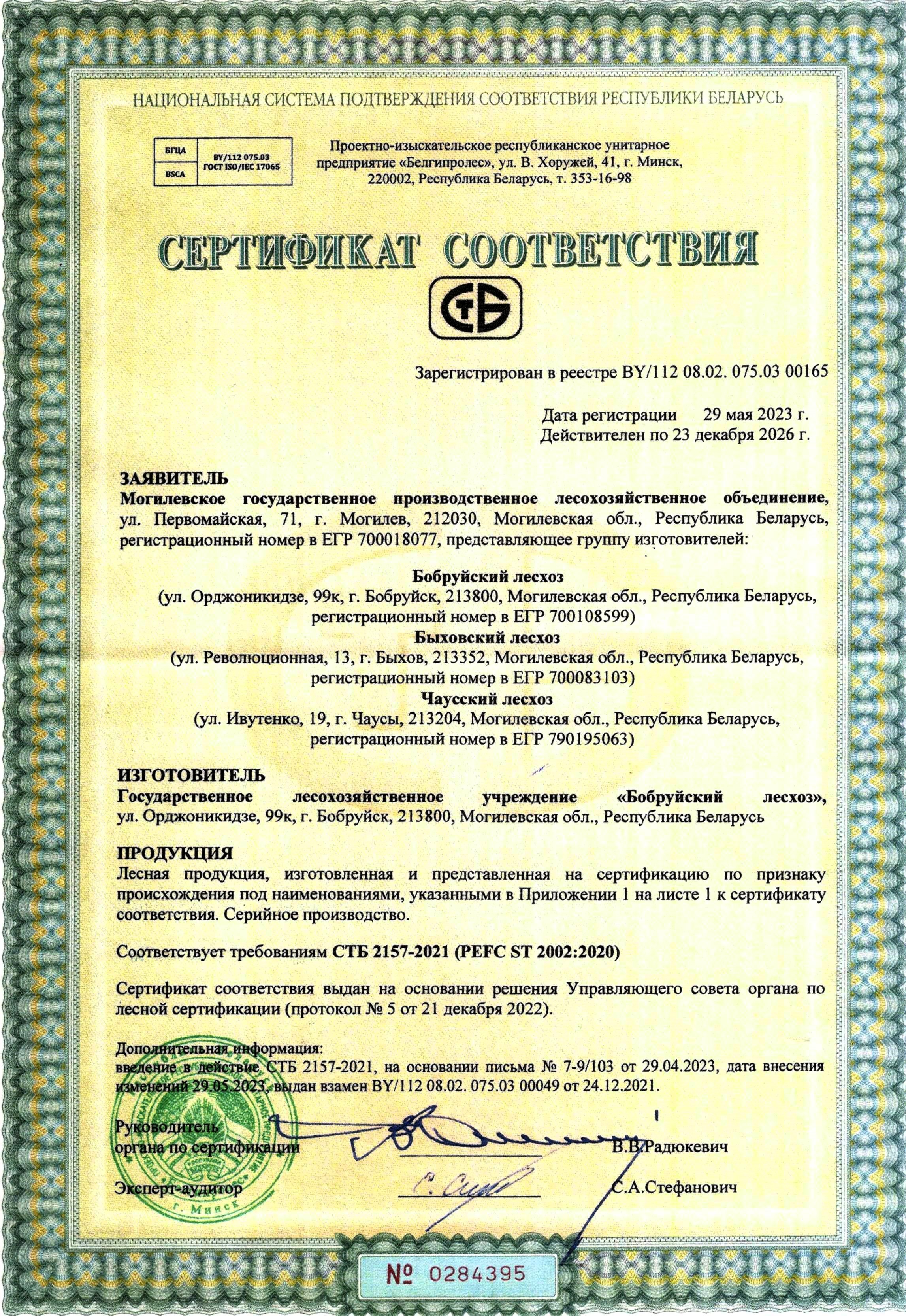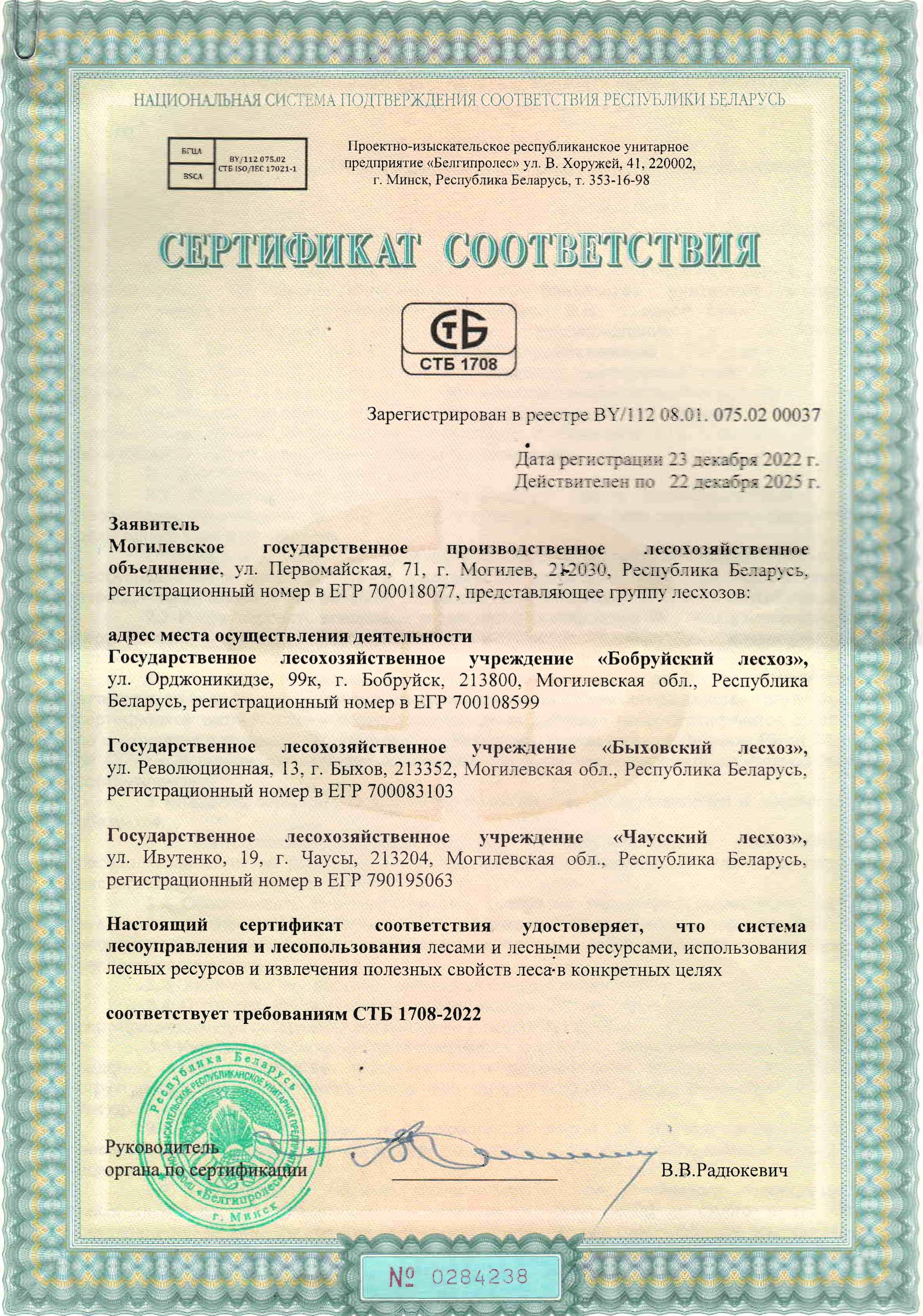 Лесхозом получены сертификаты соответствия на системы лесоуправления и лесопользования, лесную продукцию по признаку происхождения по международной схеме лесной сертификации PEFC в рамках национальной системы лесной сертификации.